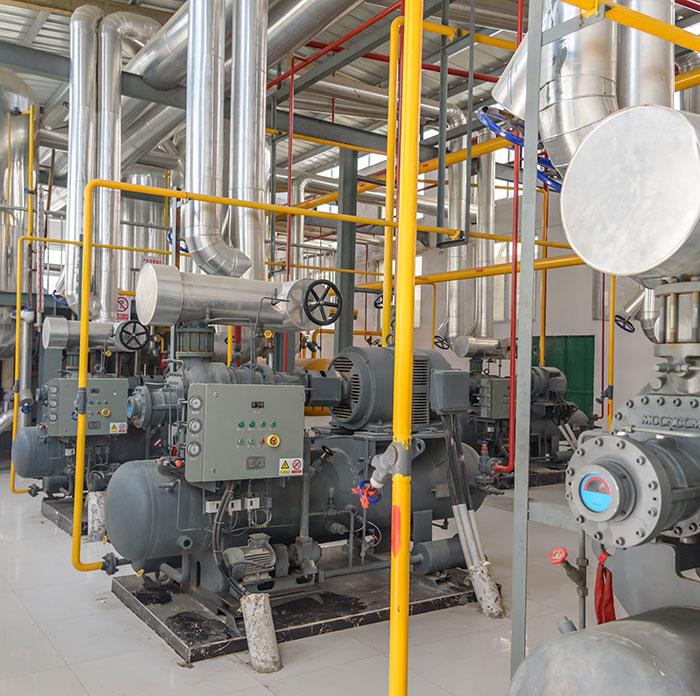 保留原室內(nèi)換熱器,如庫內(nèi)吊頂排管、速凍擱架、冷風(fēng)機(jī)、制冰系統(tǒng)中的螺旋蒸發(fā)管等換熱蒸發(fā)器設(shè)備,只是將制冷主機(jī)設(shè)備更換成氟制冷機(jī)組;制取低溫載冷劑輸送至室內(nèi)換熱器進(jìn)行換熱,從而達(dá)到設(shè)定溫度。具有施工簡單、改成周期短、管路方便、成本低等特點(diǎn)。溫度范圍可在 15℃至-70℃進(jìn)行。采用載冷劑間接制冷,不存在直接蒸發(fā)系統(tǒng)中回油難、制冷劑容易泄漏、漏點(diǎn)難檢測、分液不均勻等難題;只需對制冷主機(jī)做定期保養(yǎng)即可,故障率低、維修費(fèi)用省。 設(shè)備可根據(jù)冷庫實(shí)際負(fù)荷實(shí)現(xiàn)10%~100%進(jìn)行能量調(diào)節(jié),同時通過冷凍泵供液,不存在壓力損失、冷量損失、參數(shù)難于控制等問題;其可控性強(qiáng);故綜合能效比高。